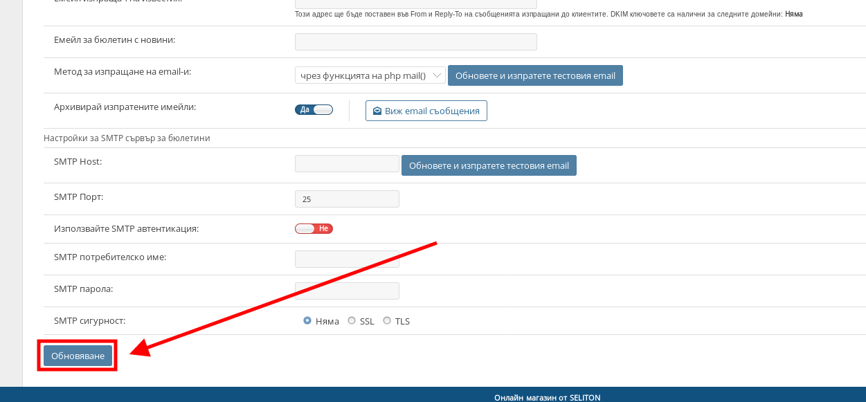 След като сте готови с настройването на имейлите във Вашия магазин, натиснете бутона “Обновяване” в долната лява част на страницата.
