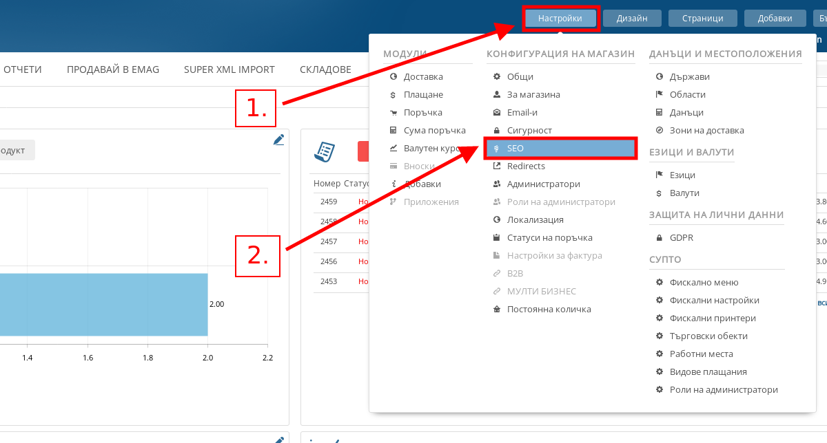 - За да отидете в SEO настройките на Вашия магазин, в административния панел посочете Настройки и натиснете върху меню “SEO”.