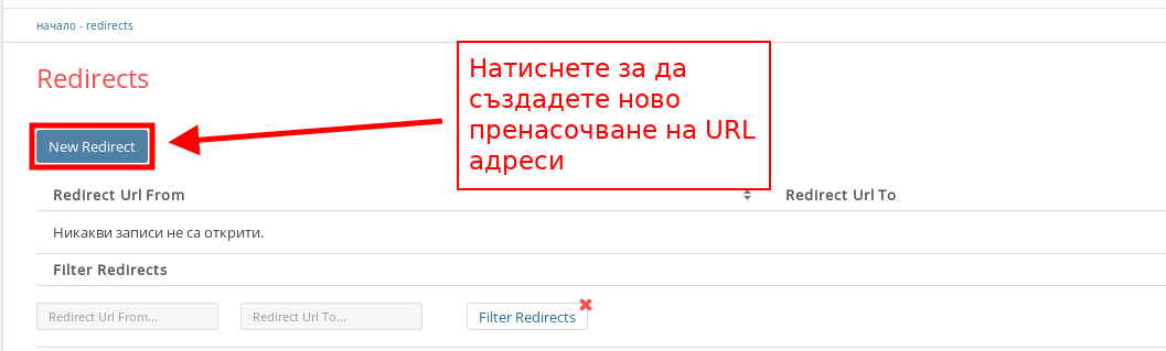 - За да създадете ново пренасочване на URL адреси, натиснете върху бутона “New Redirect”.