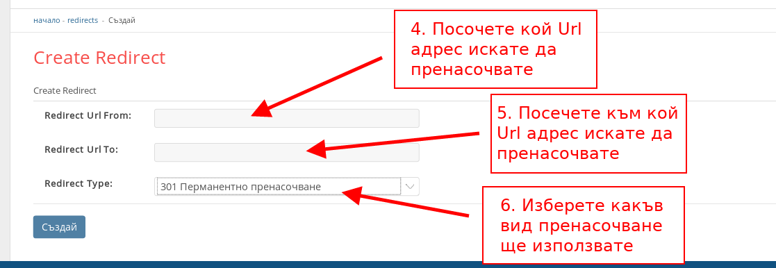 За да създадете пренасочването натиснете бутона “Създай” в долния ляв ъгъл.