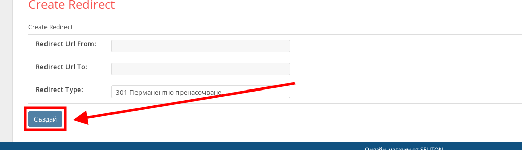 Seliton магазините имат и опция за пренасочване от една уеб страница към друга, като можете да посочите дали пренасочването е “301 Перманентно пренасочване” или “302 Временно пренасочване”.