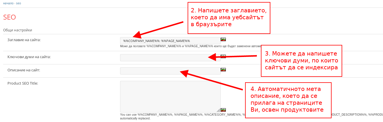 - В поле “Описание на сайт” можете да напишете мета описание, което да се прилага автоматично на всички страници, освен продуктовите.