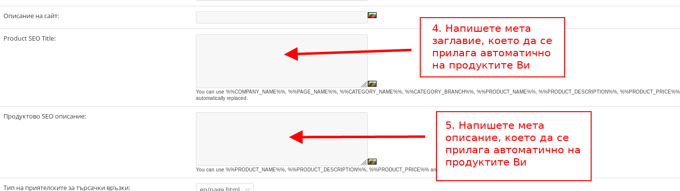 - В поле “Product SEO Title” можете да напишете автоматичното мета заглавие, което да се прилага на всички продукти, които имат поставена отметка на “автоматични SEO полета” в настройките си.