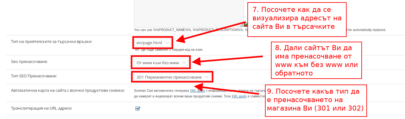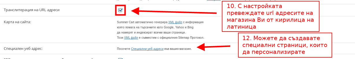 - С отметка на “Транслитерация на URL адреси” избирате url адресът на сайта ви автоматично да бъде сменян от кирилица на латиница, като така той е по-лесен за четене от търсачките.