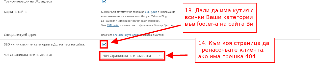 - С настройката “SEO кутия с всички категории в Долна част на сайта” можете да изберете да има кутия, в която са показани всички категории от магазина Ви във footer-а на сайта.