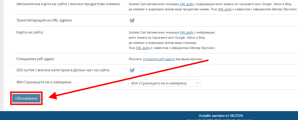След като сте готови с редакцията на SEO настройките на магазина Ви, натиснете бутона “Обновяване” в долния ляв ъгъл на страницата.