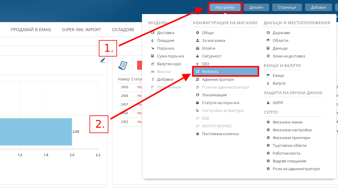 - За да създадете пренасочване от един URL адрес към друг, във Вашия административен панел посочете Настройки и натиснете върху меню “Redirects”.