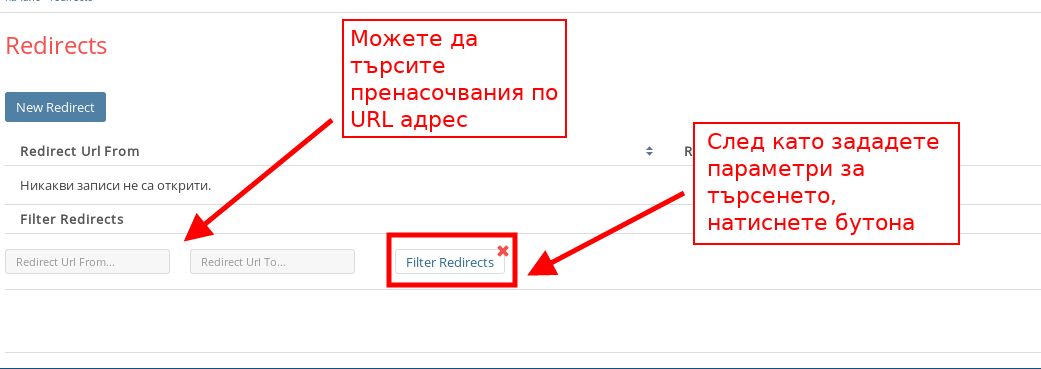 - Можете да филтрирате създадените пренасочвания чрез настройките за филтриране под списъка. След като зададете кой URL търсите, натиснете бутона “Filter Redirects” за да филтрирате.