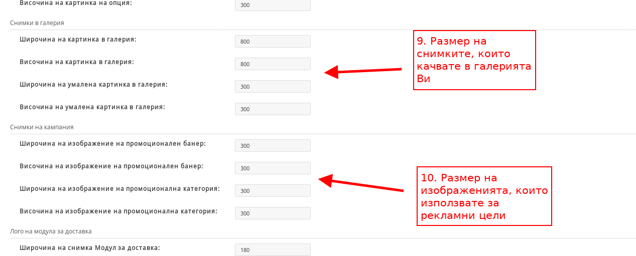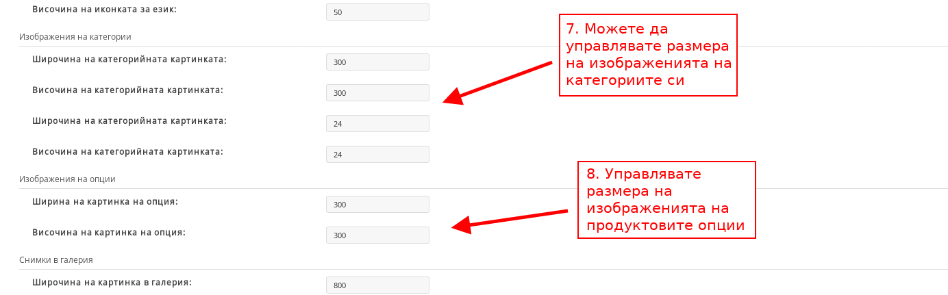 - В полетата под “Снимки в галерия” управлявате размера на изображенията, които качвате в галерията на магазина си.