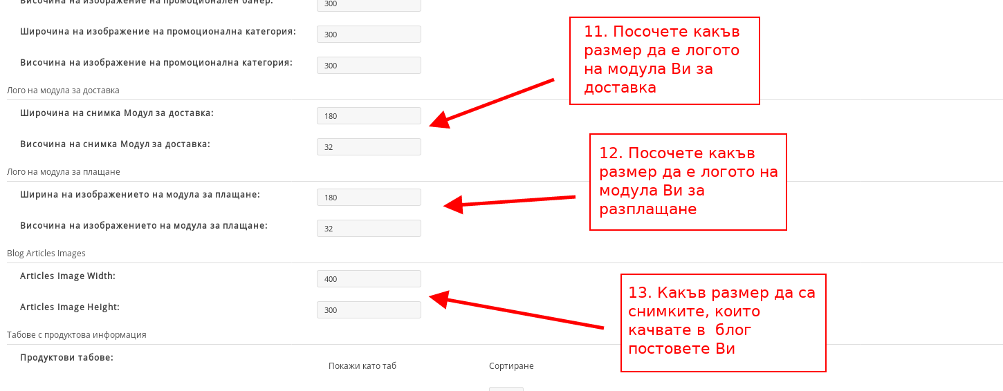 - В полетата под “Blog Articles Images” посочете какъв да е размерът на изображенията в блог статиите Ви.