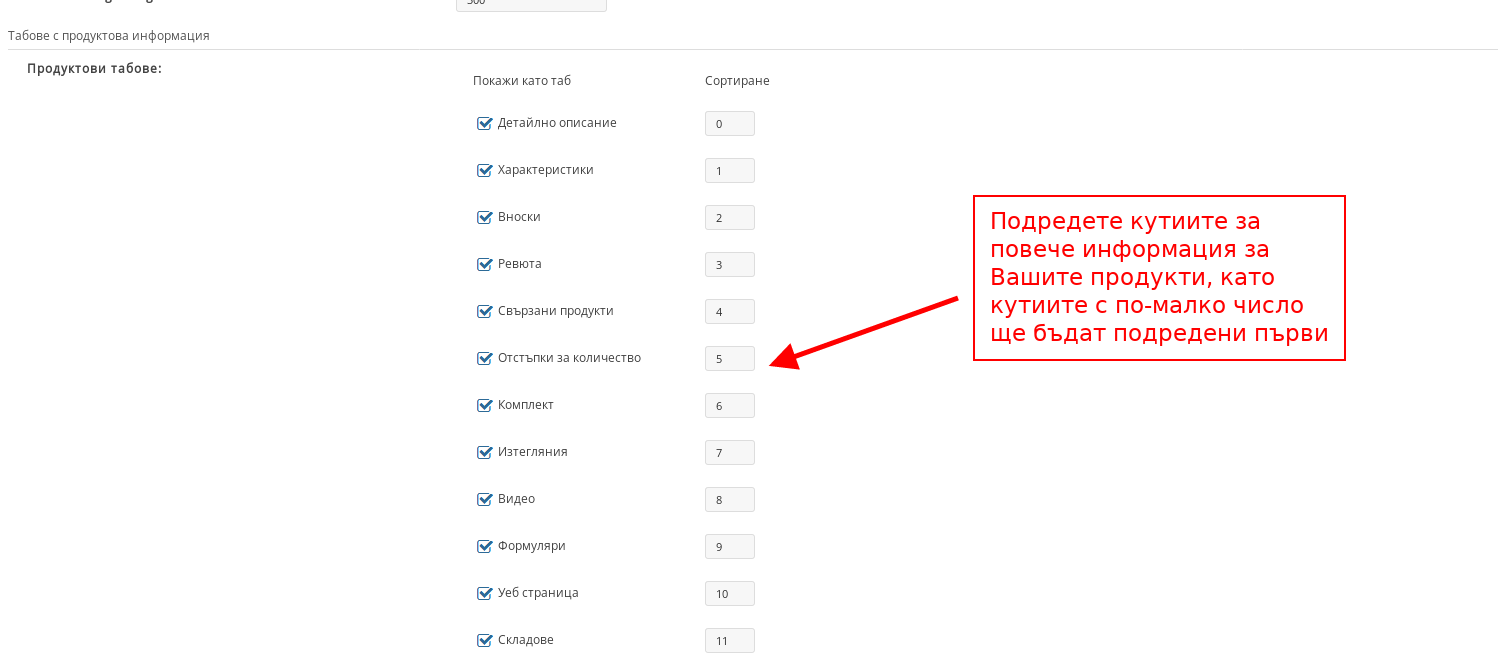 - С настройките под “Продуктови табове” избирате как да са подредени кутиите за повече информация за Вашите продукти, като кутиите с по-малко число, ще бъдат сортирани да са първи.