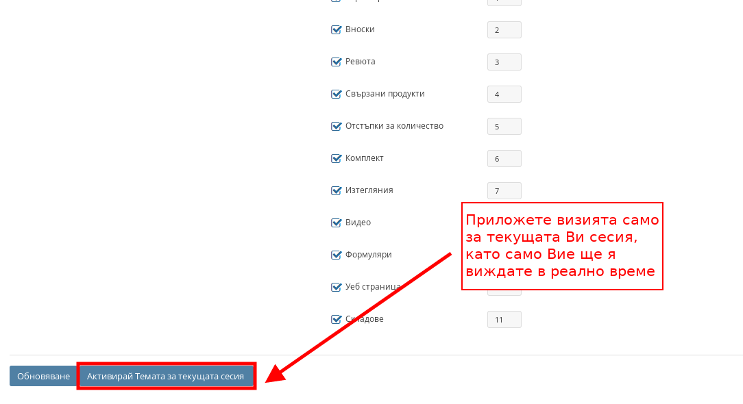 - С бутона “Активирай темата за текущата сесия” активирате дизайн темата единствено за себе си за текущата сесия и никой друг няма да я вижда в магазина Ви. Тази настройка е подходяща да правите промени по визията на магазина си, без да трябва в реално време те да се прилагат.