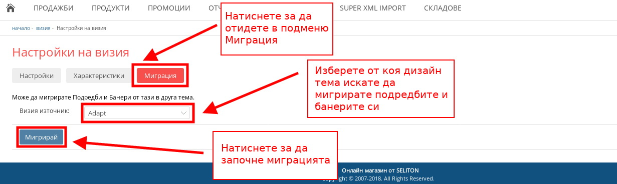 - В подменю “Миграция” можете да прехвърлите Вашите подредби и банери от друга дизайн тема, в която са качени. Изберете дизайн темата от падащото меню, след което натиснете бутона “Мигрирай”.