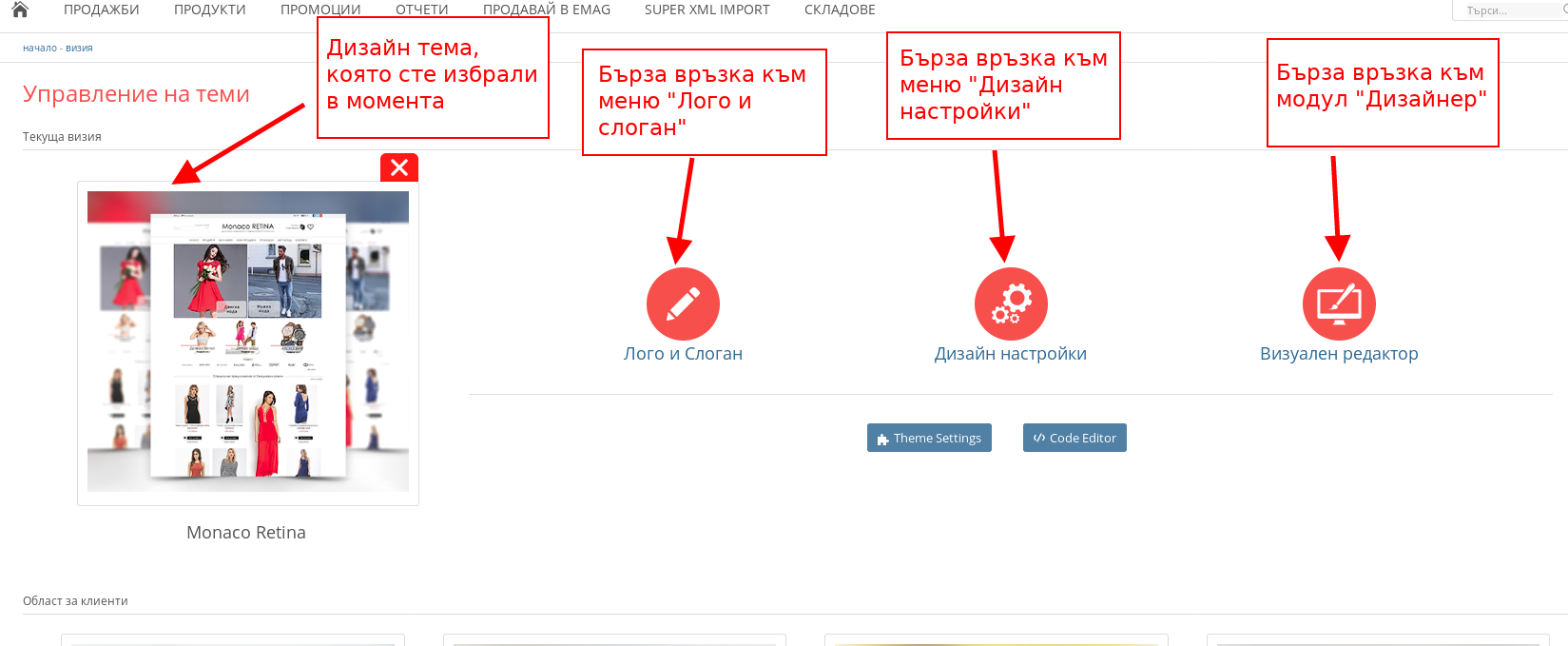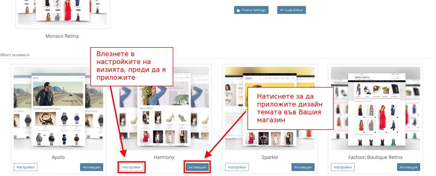 - Под раздела “Област за клиенти” са всички дизайн теми, които можете да приложите върху магазина си. За да приложите някоя дизайн тема натиснете бутона “Активация”, а за да влезнете в настройките ѝ преди да я активирате, натиснете бутона “Настройки”.