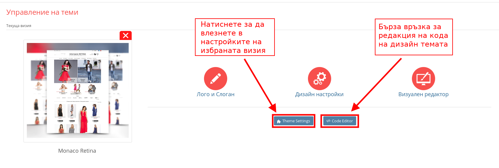 - Под тези големи бутона за бърза връзка имате бутон "Theme settings", с който да влезнете в настройките на темата, която сте избрали в момента. Имате и бутон "Code Editor" за редактиране на кода на дизайн темата.