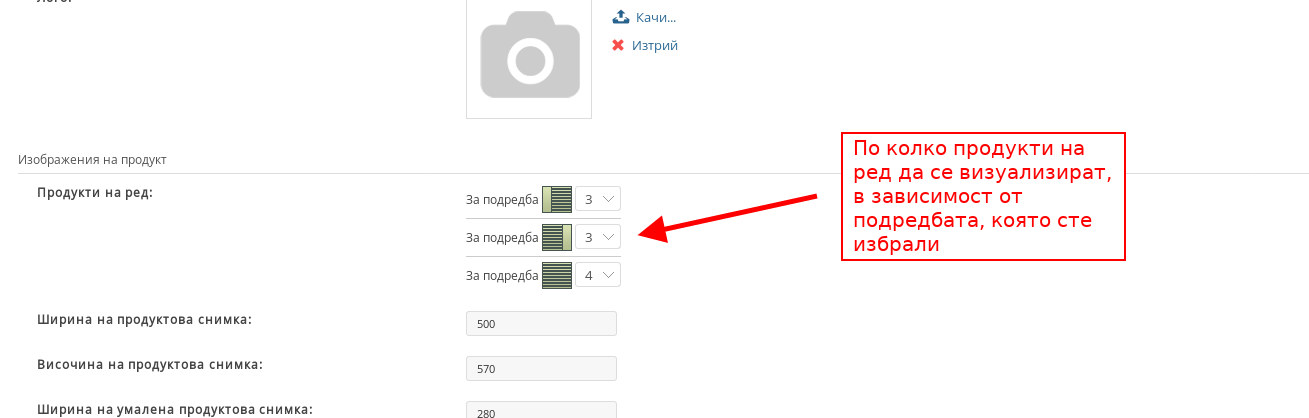 - С полетата под “Изображения на продукт” можете да управлявате височината и ширината на продуктовите Ви снимки.