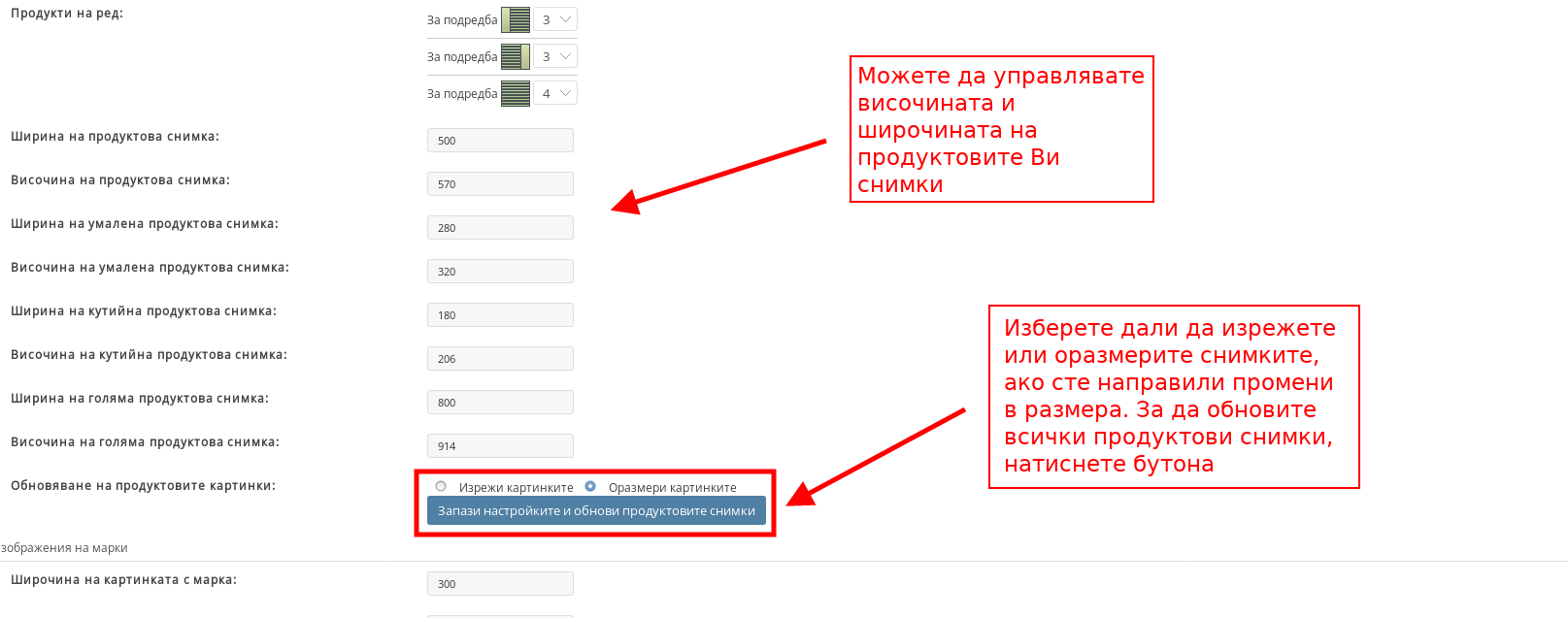 - С полетата под “Изображения на марки” можете да управлявате размера на изображенията на марките във Вашия магазин.