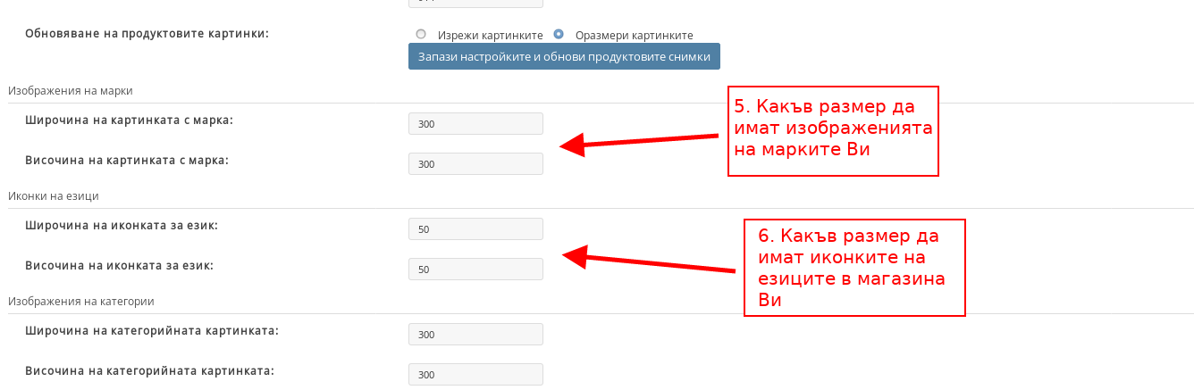 За да запазите промените по размера на продуктовите Ви снимки и да промените размера им, натиснете бутона “Запази настройките и обнови продуктовите снимки”, като можете да изберете да изрежете картинките или да ги оразмерите.