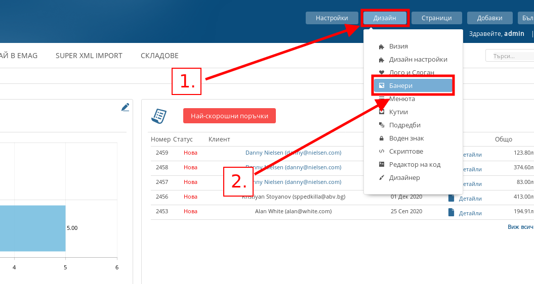 - За да отидете в менюто за управление и създаване на нови банери, във Вашия административен панел посочете Дизайн и натиснете върху “Банери”.