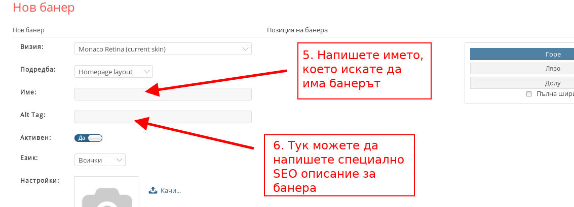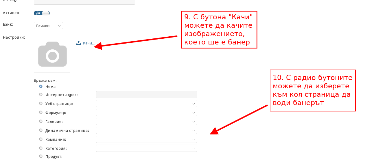 - В поле “Alt tag” можете да въведете специален текст със SEO насоченост, който обикновено се използва да се описва какво се вижда на банера. Текстът се визуализира ако мишката се задържи върху банера или ако той не зареди.