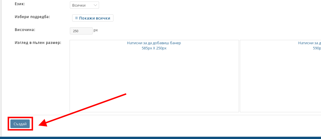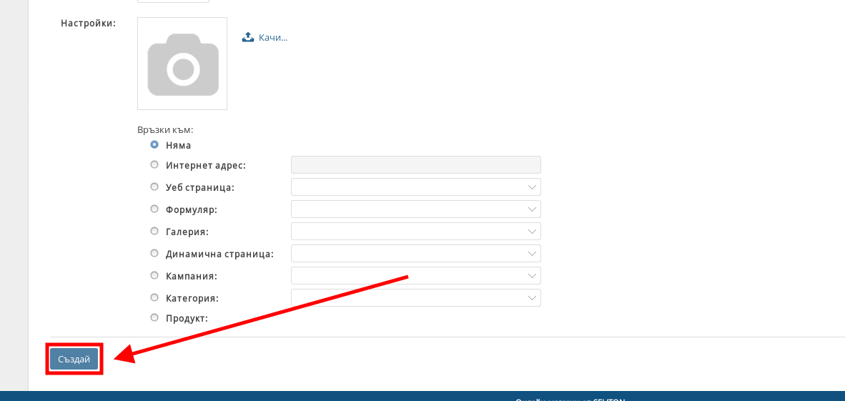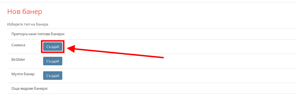 - За да създадете банер тип снимка, натиснете бутона “Създай” на реда “Снимка”.