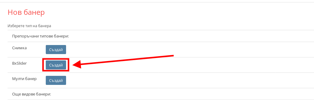 - За да създадете банер тип BxSlider, натиснете бутона “Създай” на реда “BxSlider”.
