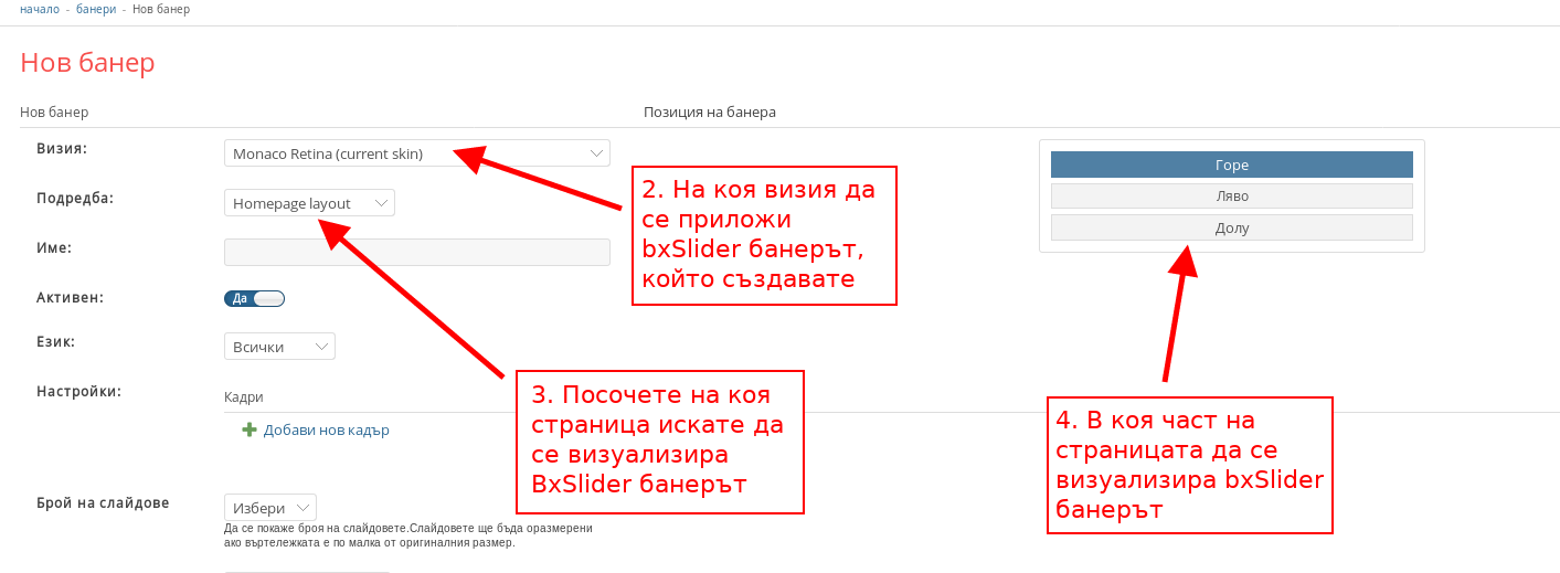- С настройките под “Позиция на банера” посочете в коя част на страницата да се визуализира bxSlider банерът, като според визията, той може да се визуализира на различни места.