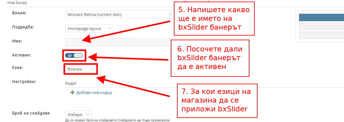 - С настройката “Активен” избирате дали bxSlider банерът да е активен.