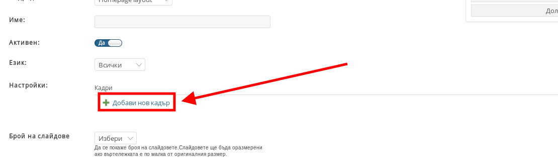 - За да добавите изображения за сменящи се банери, под Кадри натиснете “Добави нов кадър”.
