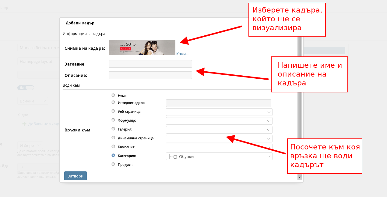След като натиснете бутона ще се отвори изскачащ прозорец, в който можете да изберете кадъра, да му напишете име и описание и да изберете към коя връзка да води той. След като настроите кадъра, натиснете “Затвори”.