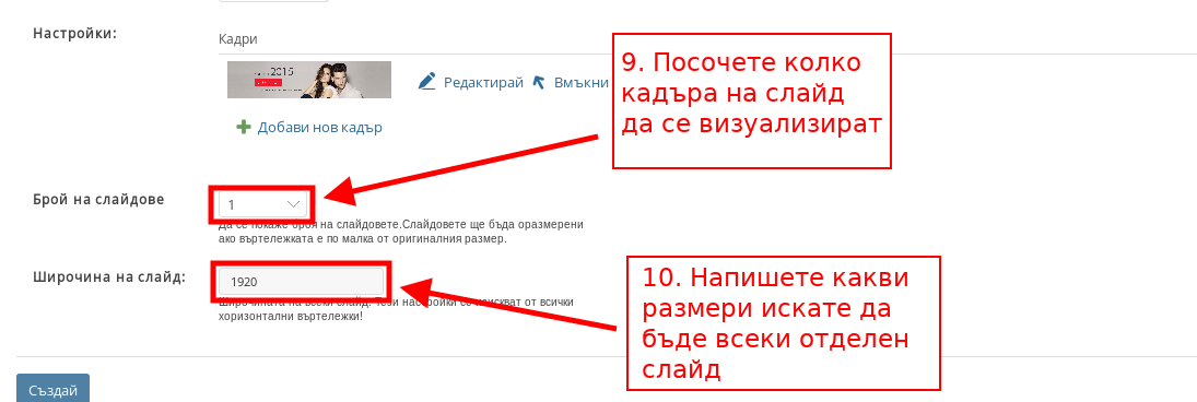 - В полето “Широчина на слайд” напишете какви размери искате да е широчината на слайда. Ако искате да имате повече от 1 кадър на слайд, имайте предвид, че трябва да се съобразявате с широчината на страницата - ако широчината е 1920 пиксела, то ако имате 2 кадъра всеки от тях трябва да има широчина от най-много 960 пиксела. За ваше удобство можете да зададете стойността по подразбиране - 0.
