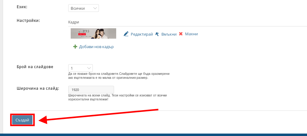 Когато сте готови с настройването на bxSlider банера, натиснете бутона “Създай” в долния ляв ъгъл.