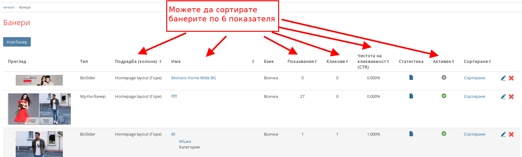 - Можете да сортирате банерите по 6 показателя в списъка с банери, като можете да сортирате по: