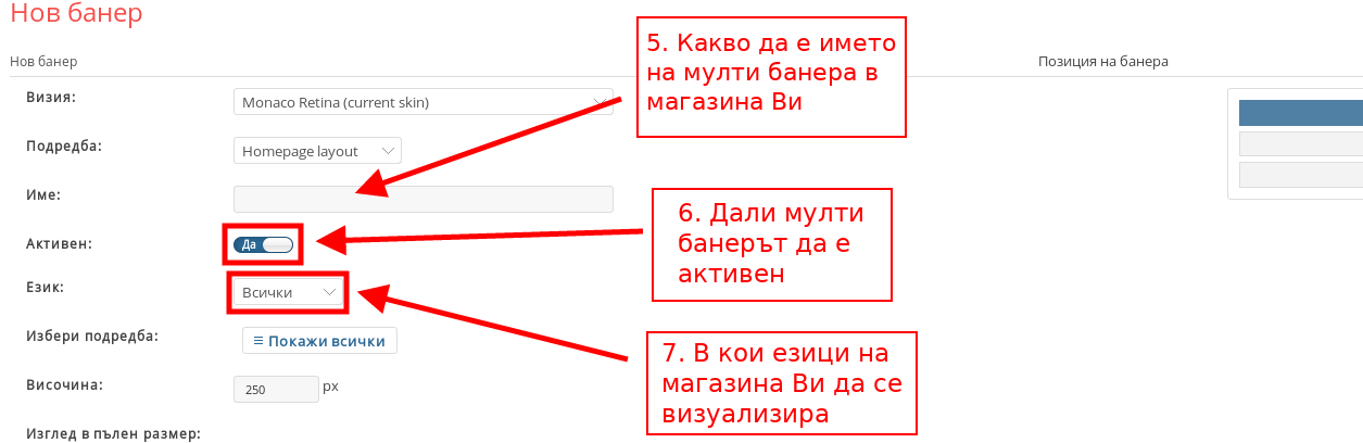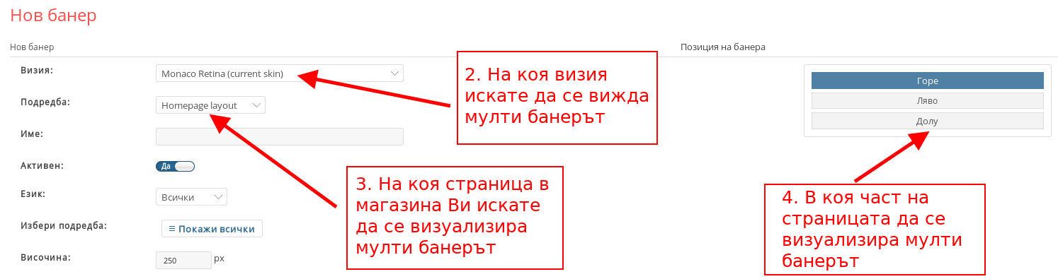 - С настройките под “Позиция на банера” посочете в коя част на страницата да се визуализира мулти банерът, като според визията, той може да се визуализира на различни места.