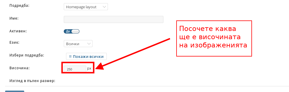 - Преди да качите мулти банера е важно да изберете каква ще е височината на изображенията, които качвате. За да направите това, в полето “Височина” напишете колко пиксела ще е всяко изображение.