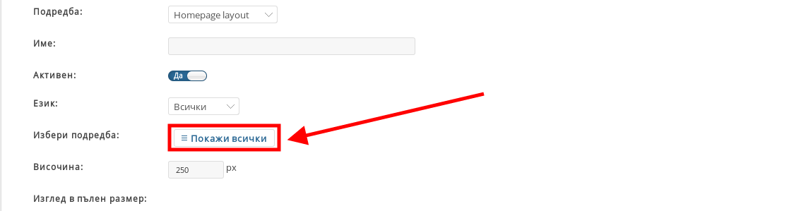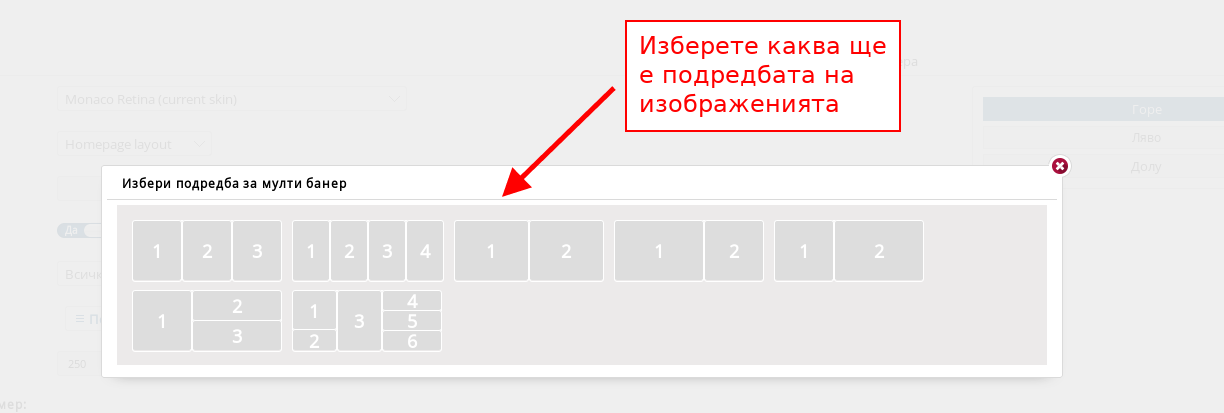 - За да качите мулти банер, първо трябва да изберете каква ще е подредбата на изображенията. За да направите това натиснете бутона “Покажи всички” на реда “Избери подредба”.