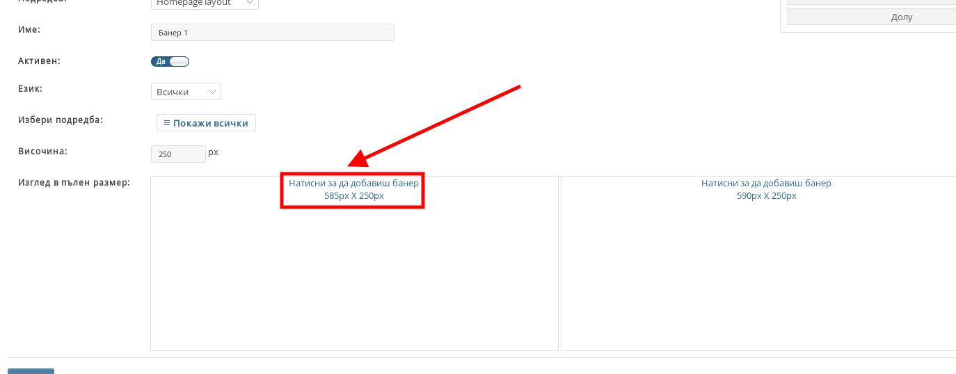 - В падащото меню “Подредба” изберете на коя страница в магазина Ви да се визуализира банерът.