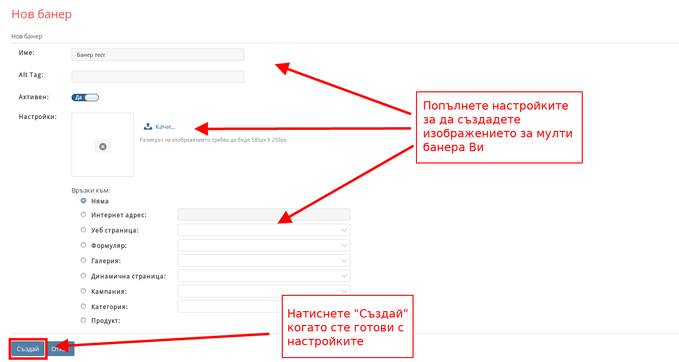 - С настройката “Активен” избирате дали мулти банерът да е активен.