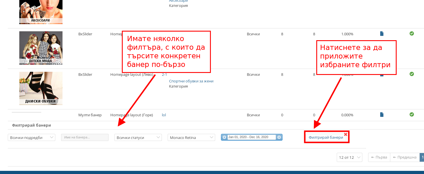 - Ако търсите конкретен банер и имате голям списък с банери, в долната част на страницата има настройки за филтриране:
