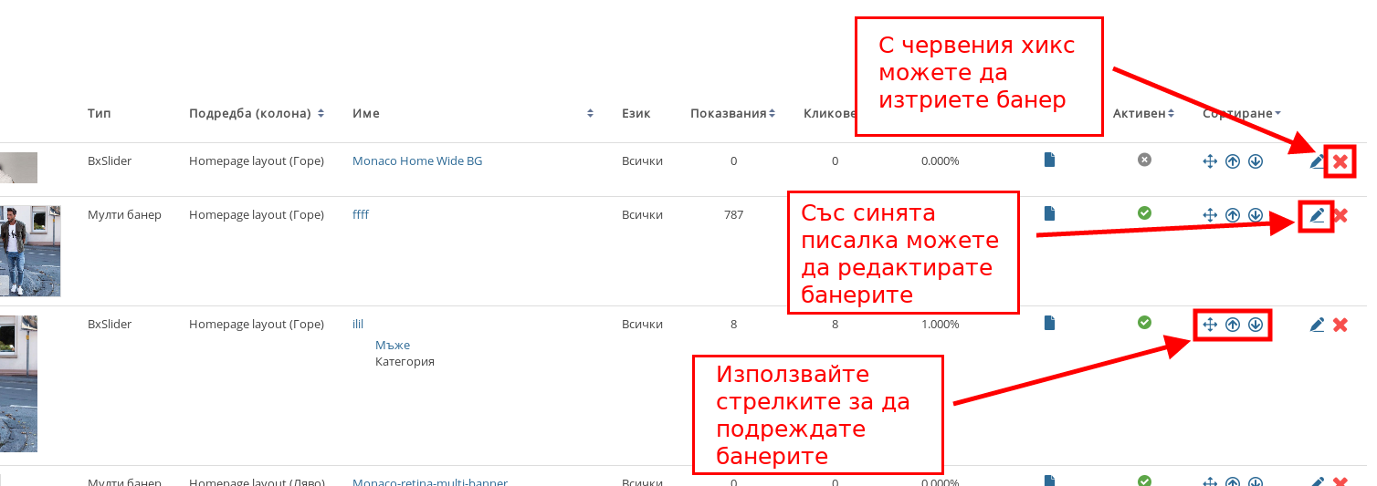 - С бутоните в най-дясната част на реда на всеки банер можете да управлявате подреждането на списъка Ви с банери, да редактирате банера със синята писалка или да изтриете банера с червения хикс.