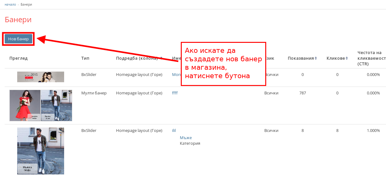 - За да създадете нов банер за Вашия магазин, натиснете бутона “Нов банер” в горната лява част на списъка с банери.