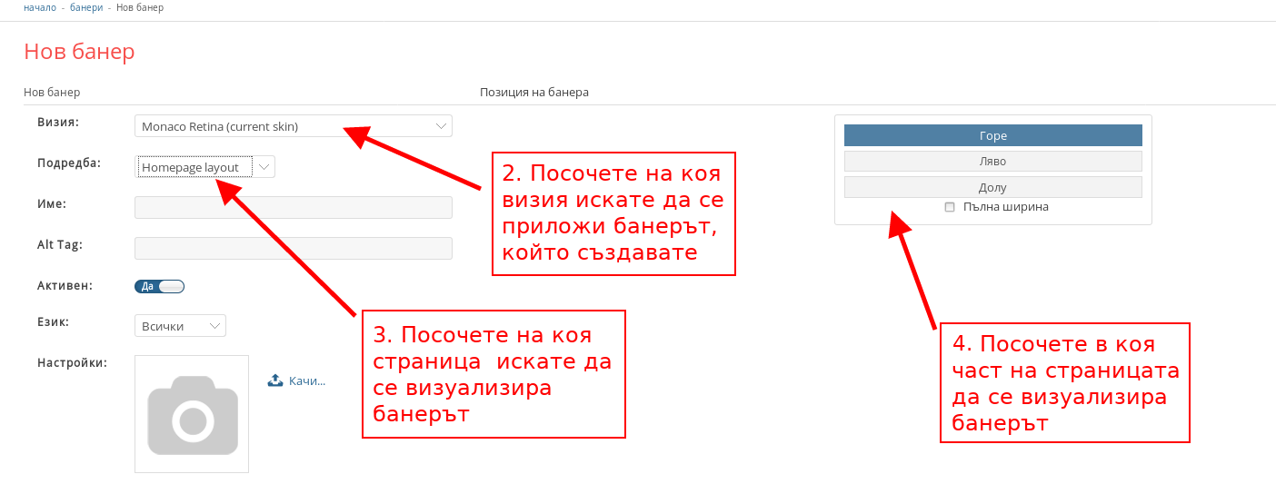 - С настройките под “Позиция на банера” посочете в коя част на страницата да се визуализира банерът, като според визията, той може да се визуализира на различни места.