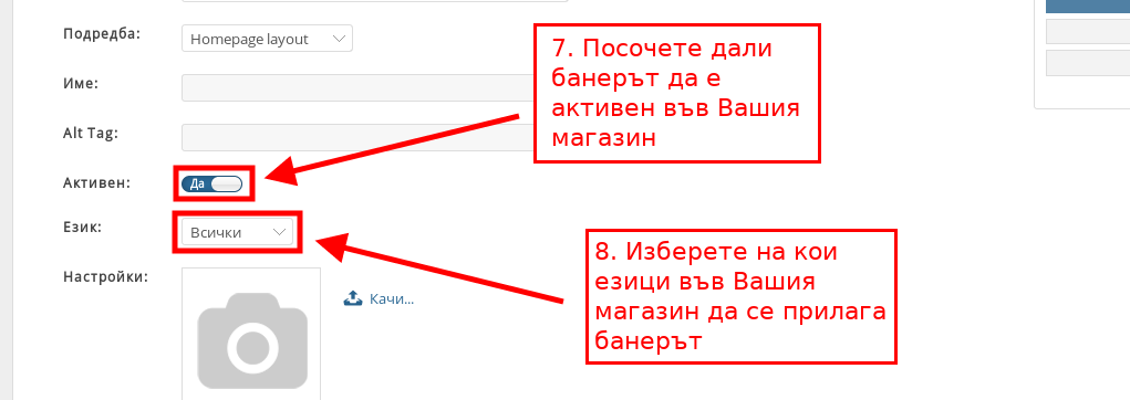 - Като натиснете бутона “Качи” до снимката на фотоапарат можете да качите изображението, което искате да използвате за банер в магазина Ви.