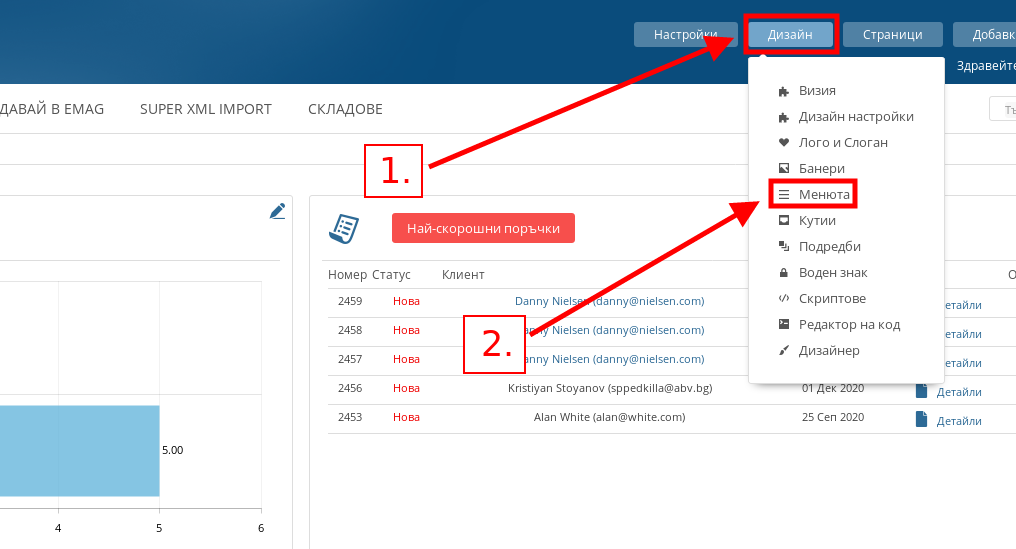 - За да отидете в настройките на менютата на Вашия магазин, в административния панел посочете Дизайн и натиснете върху меню “Менюта”.
