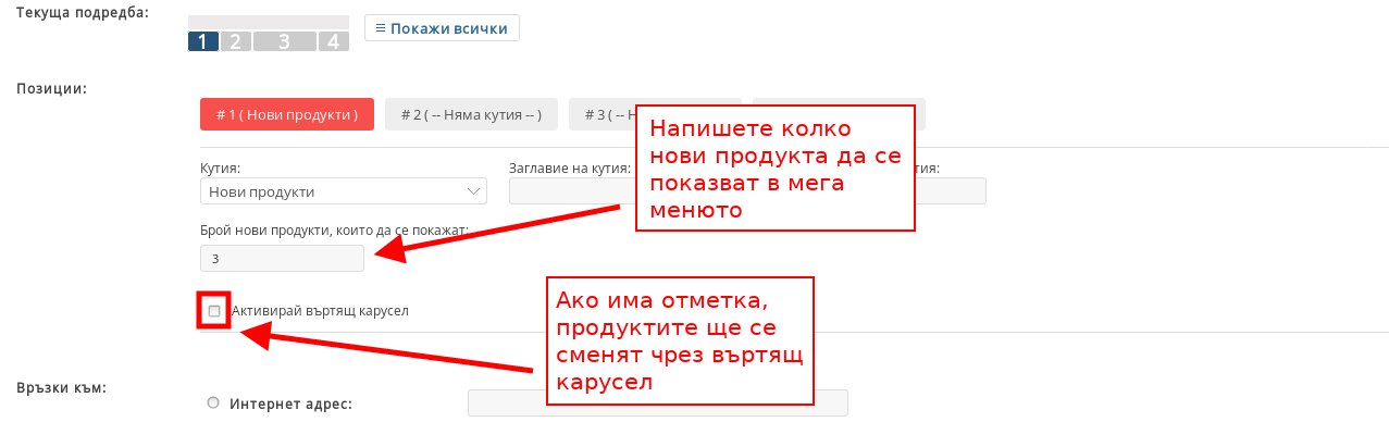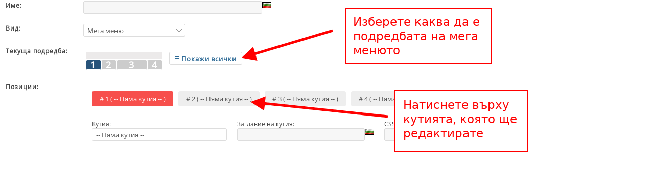 - В “Текуща подредба” изберете каква ще е подредбата на Мега менюто ви. В зависимост каква подредба изберете, ще определите колко кутии(полета) ще имате, както и какъв ще е размерът на кутиите;