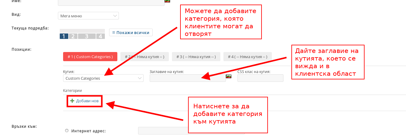 - С кутия “Custom Categories” избирате категория, която да се визуализира и към която да се създаде връзка. Настройката е удобна, ако искате да наредите няколко категории, които нямат директна връзка една под друга. Натиснете бутона “Добави нов” за да добавите категория.