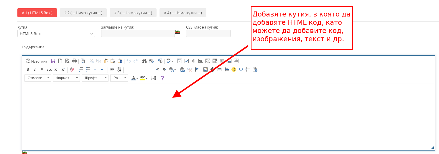 - С кутия “HTML5 Box” добавяте поле за форматиране на HTML код, в което можете да добавите код, изображения, текст и други.