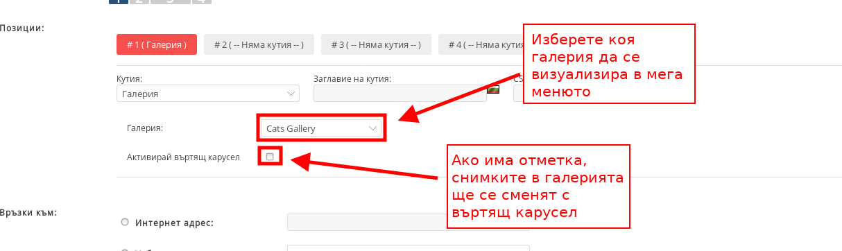 - С кутия “Галерия” можете да изберете галерия, която да се визуализира в кутията чрез падащо меню. Ако поставите отметка на “Активирай въртящ карусел”, снимките в галерията ще се сменят чрез карусел.