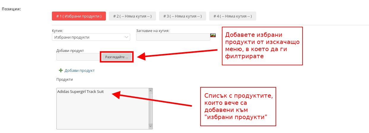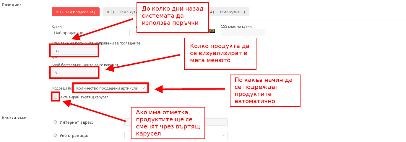 - С кутия “Най-продавани” настройвате да се показват най-продаваните Ви продукти:
