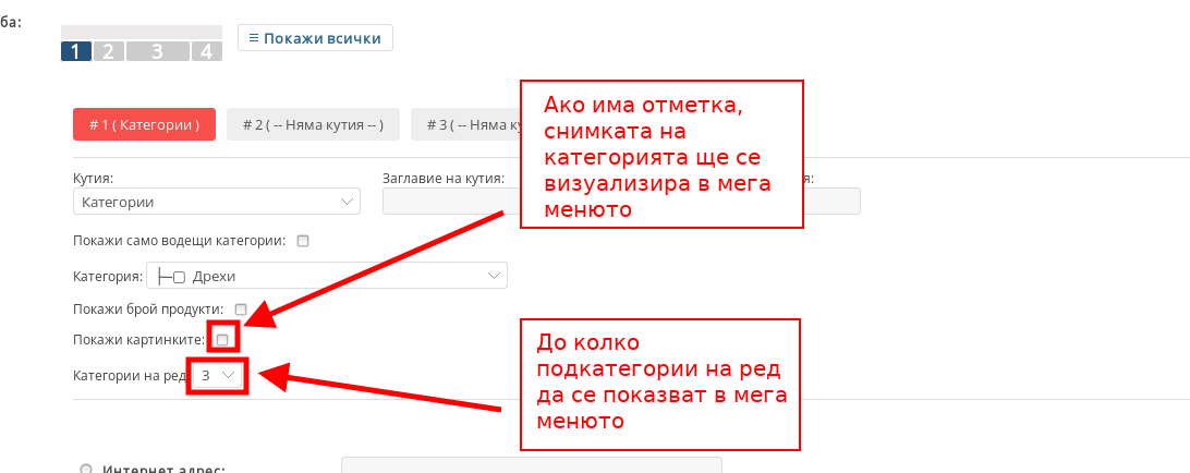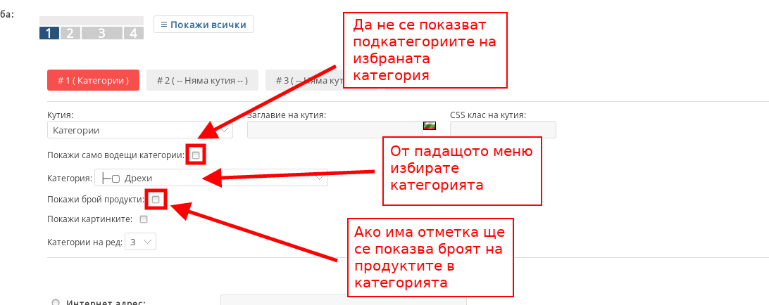 - Ако сложите отметка на “Покажи брой продукти” показвате броя на продуктите в категорията;